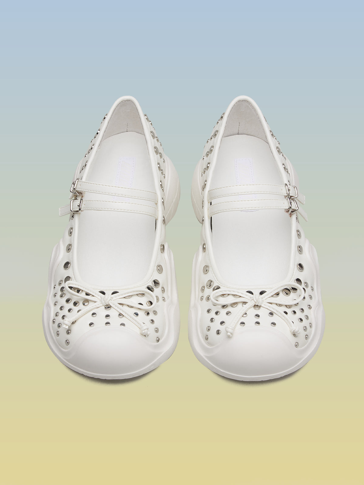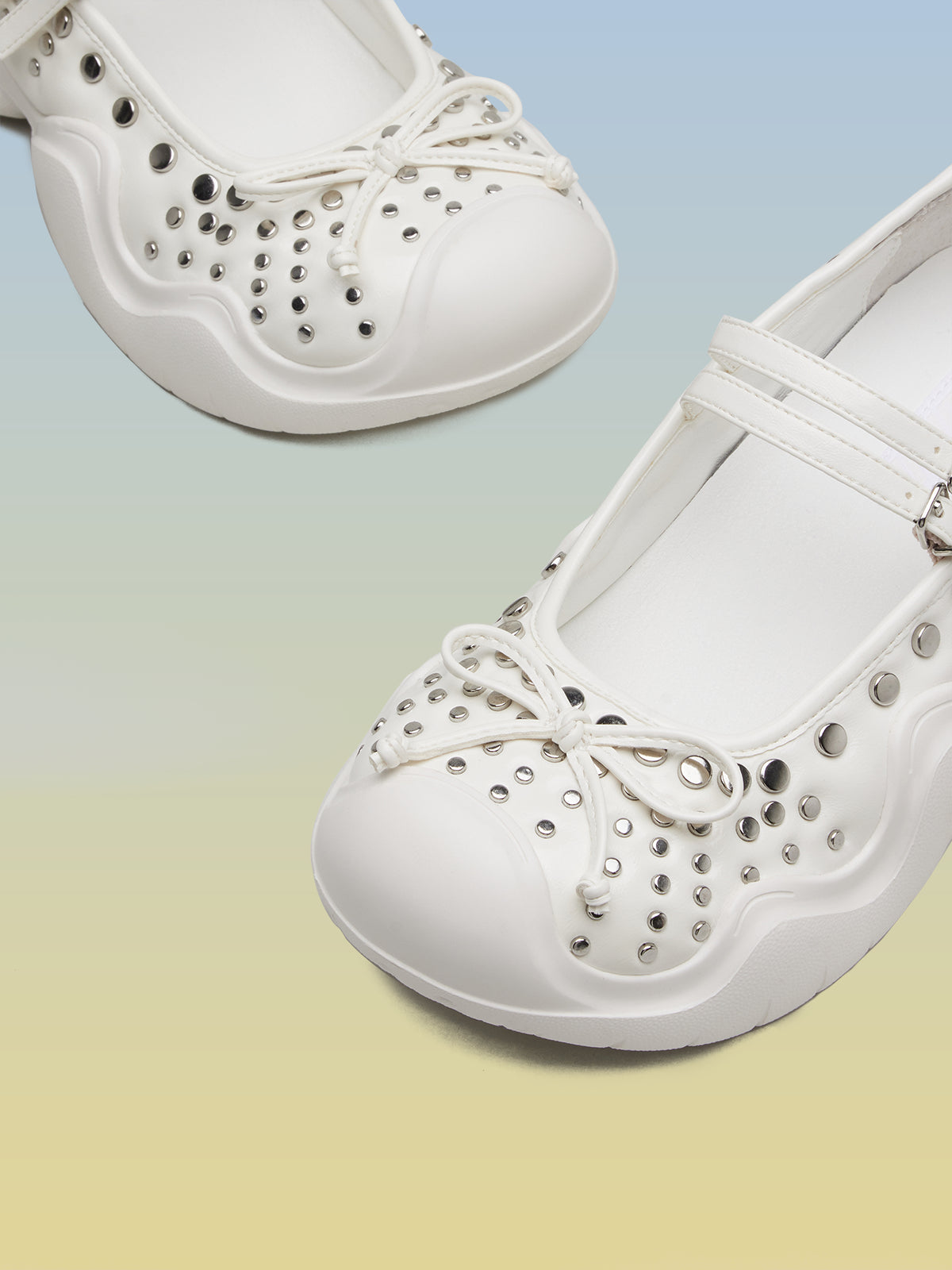 ・スタッズをあしらったバレリーナフラットに、ブランドシグネチャーのリボンディテールをプラス