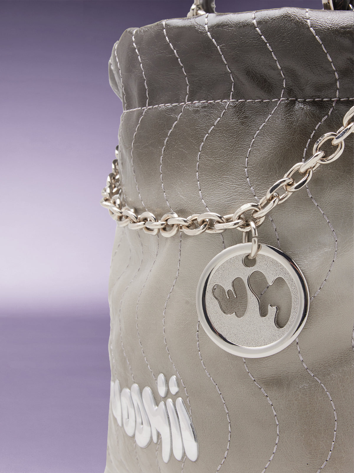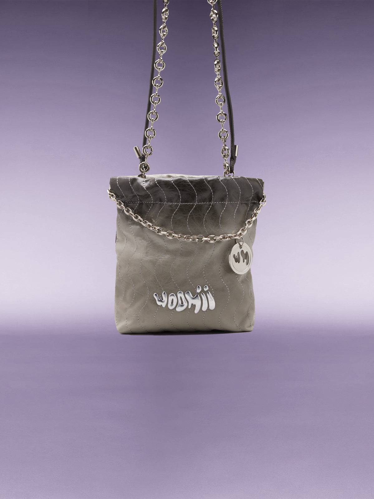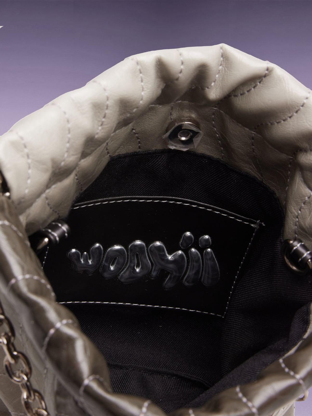 - WOOMII ロゴチャームが付いたチェーンリンクのディテール。手で持つためのハンドルトップとしても使えます。
