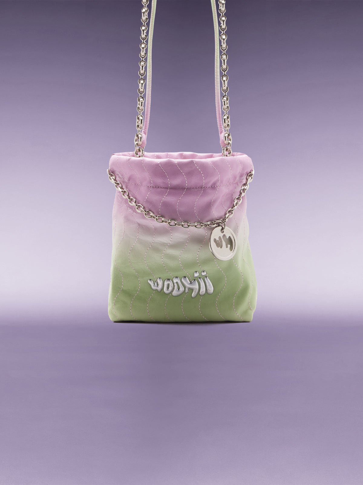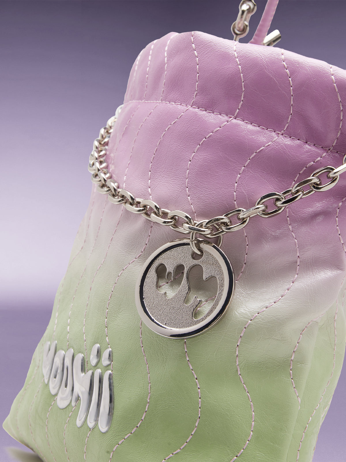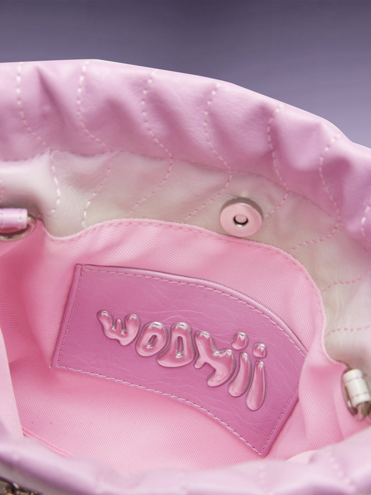 - WOOMII ロゴチャームが付いたチェーンリンクのディテール。手で持つためのハンドルトップとしても使えます。