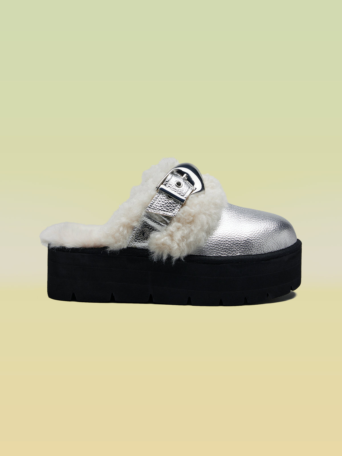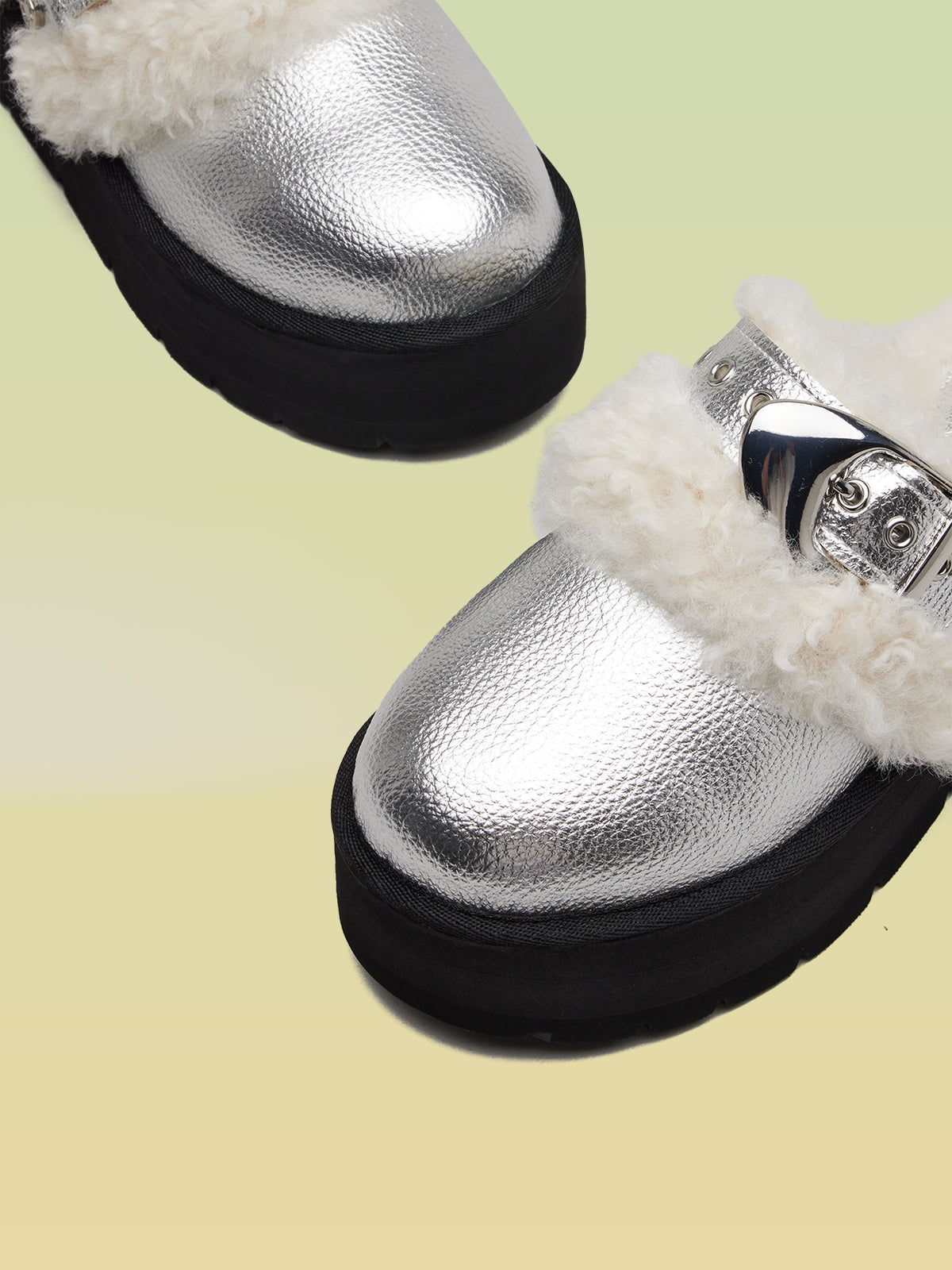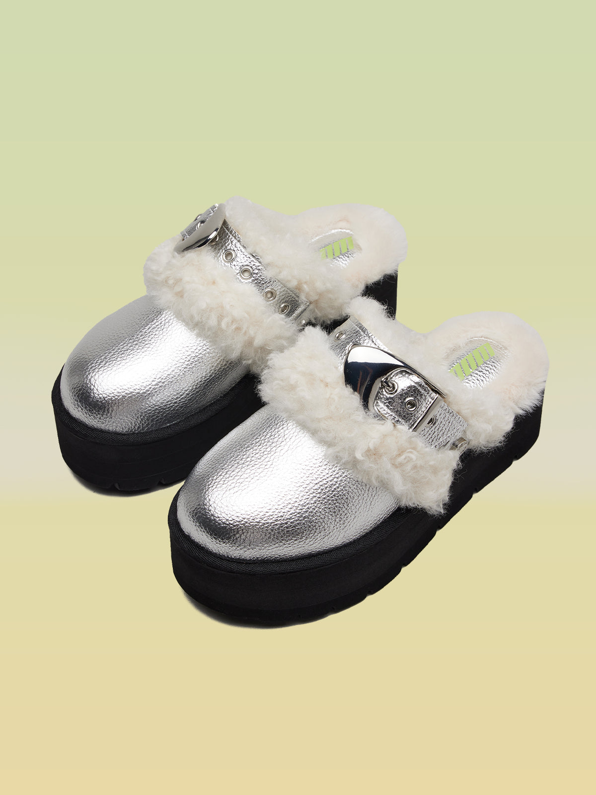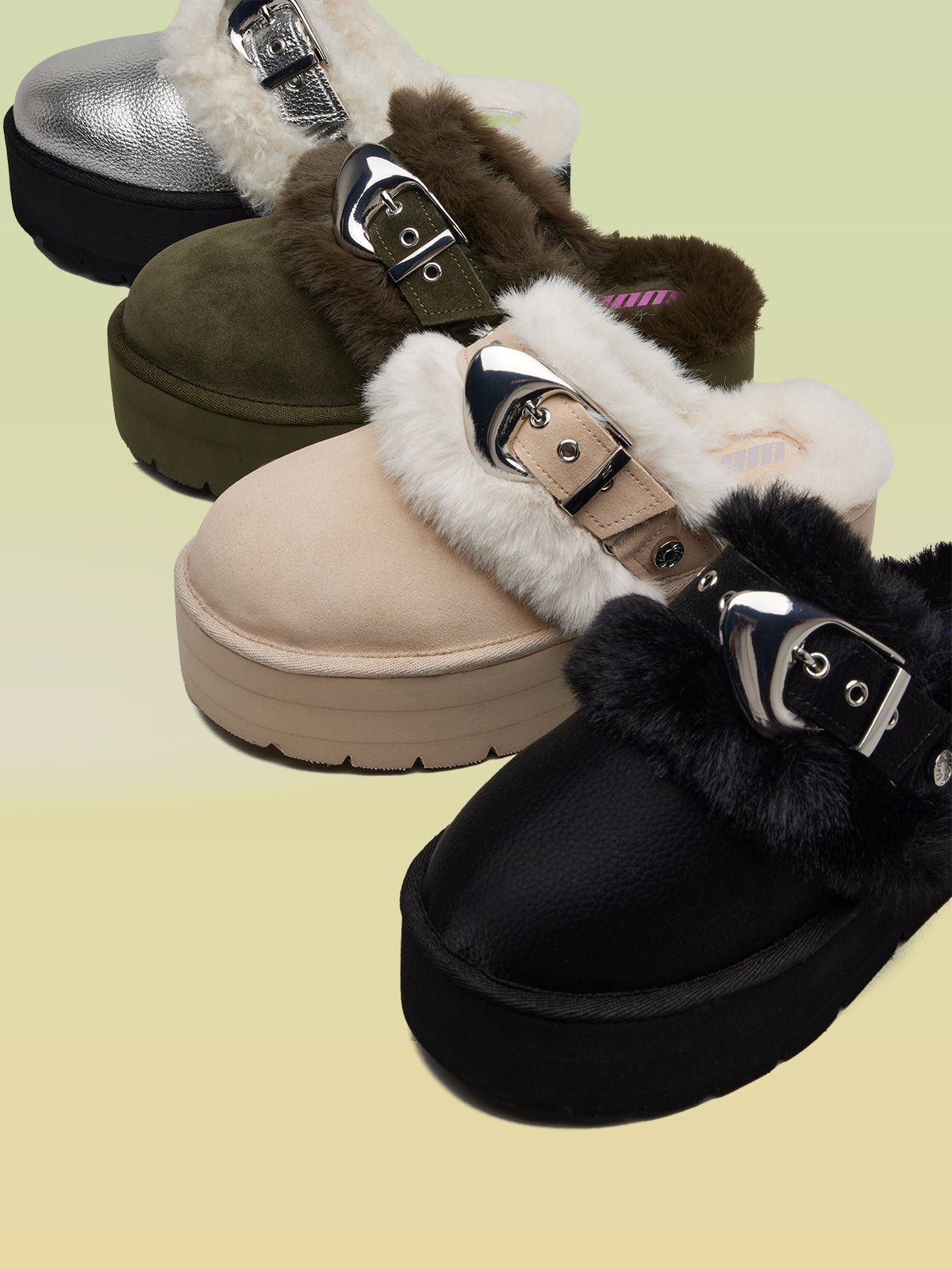 - Platform mules with bold buckle accent